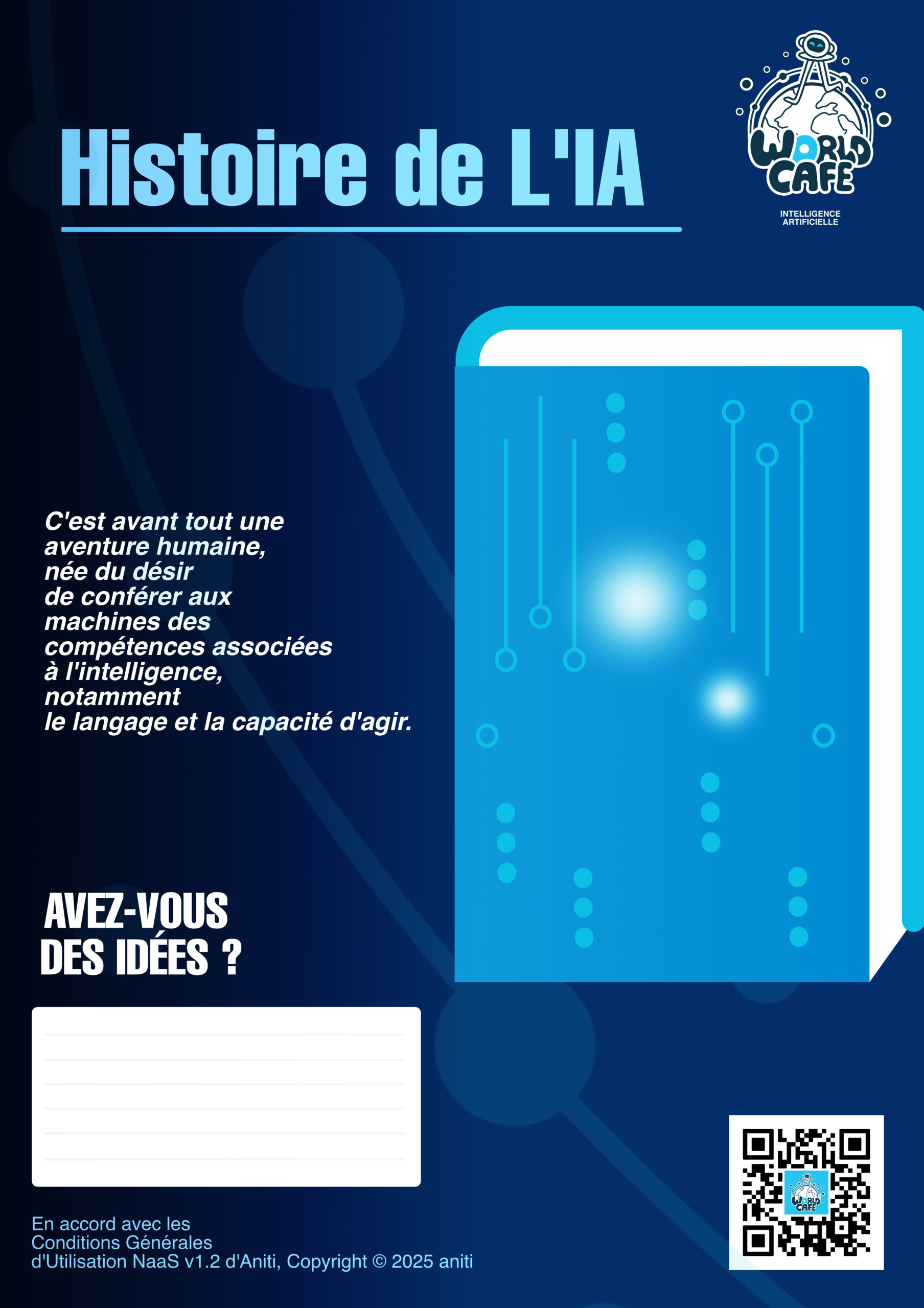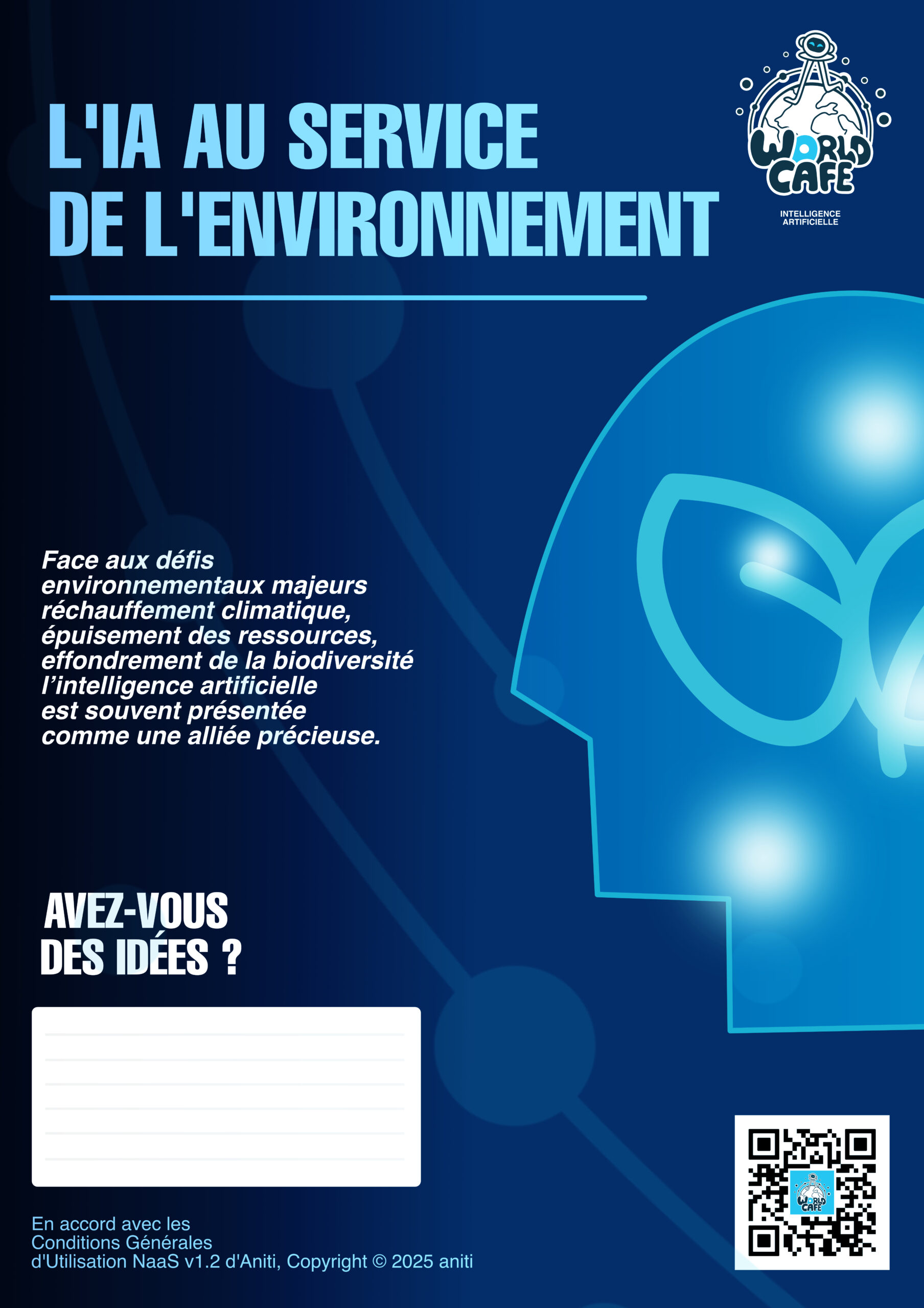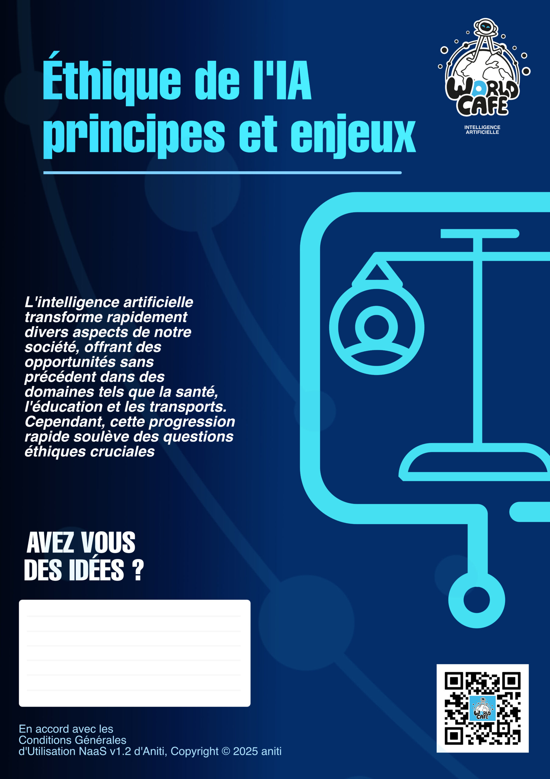 Dans ce cadre, j’ai été impliqué dans plusieurs aspects de l’organisation, notamment dans la conception éditoriale de l’événement. J’ai participé à la définition des thématiques abordées, à la formulation des questions destinées à guider les échanges et à l’adaptation des contenus pour les rendre accessibles et engageants pour les participants. J’ai également contribué à la création de visuels et de supports ludiques pour des jeux pédagogiques, inspirés de ressources issues de cafeia.org et de aniti.fr. Ces supports avaient pour objectif de stimuler la discussion, de vulgariser certains concepts liés à l’intelligence artificielle et de favoriser l’implication active des participants tout au long de l’événement.