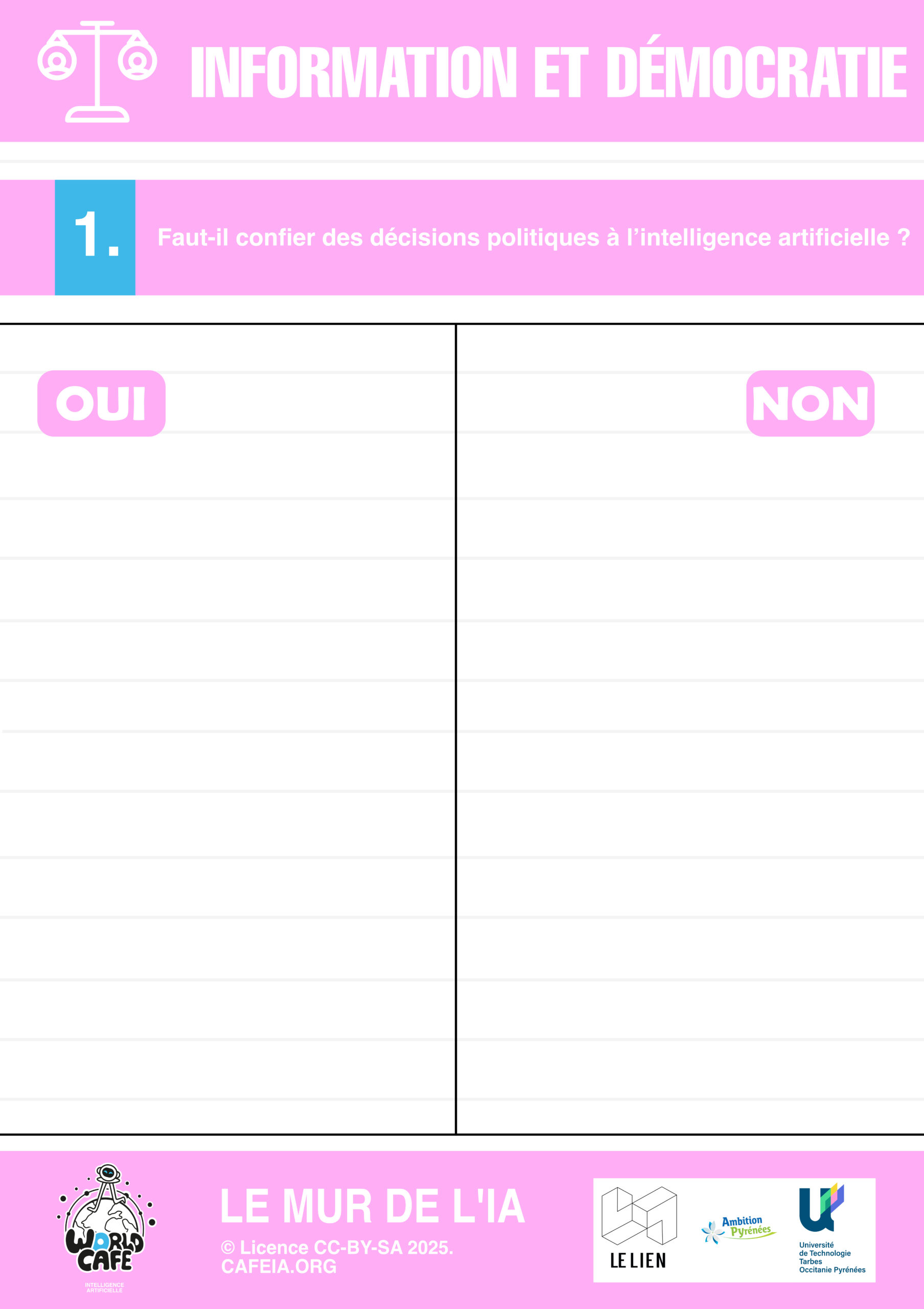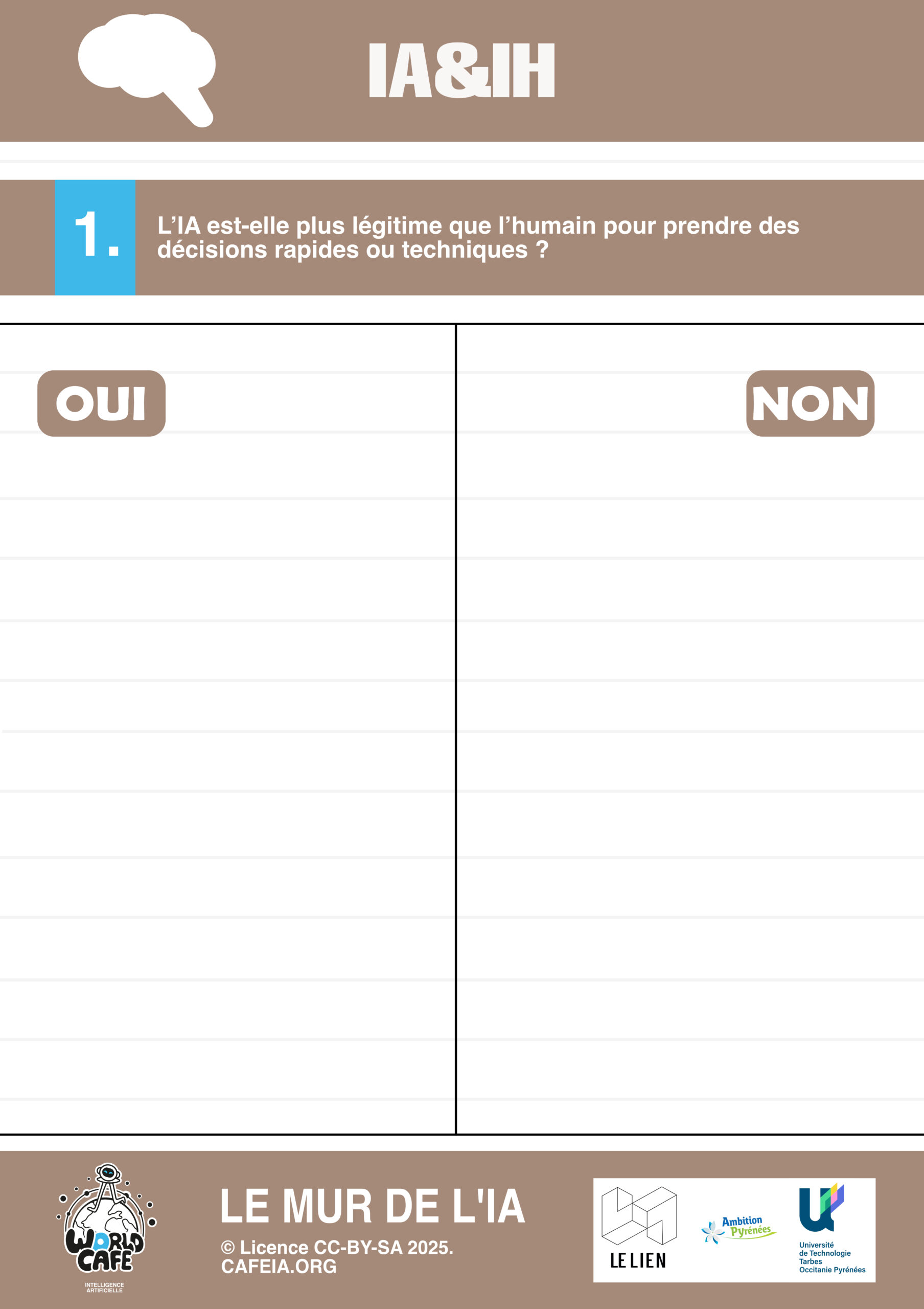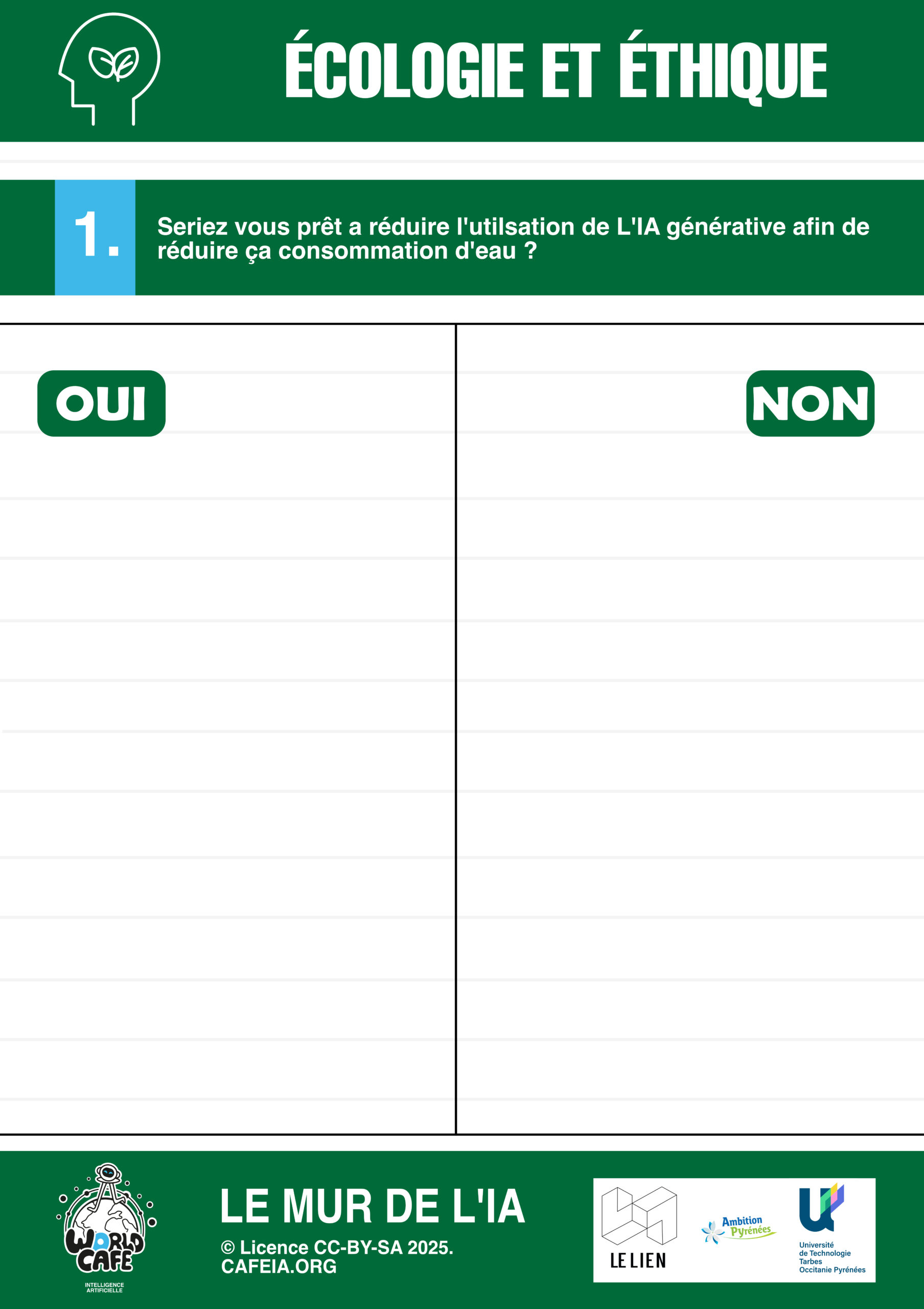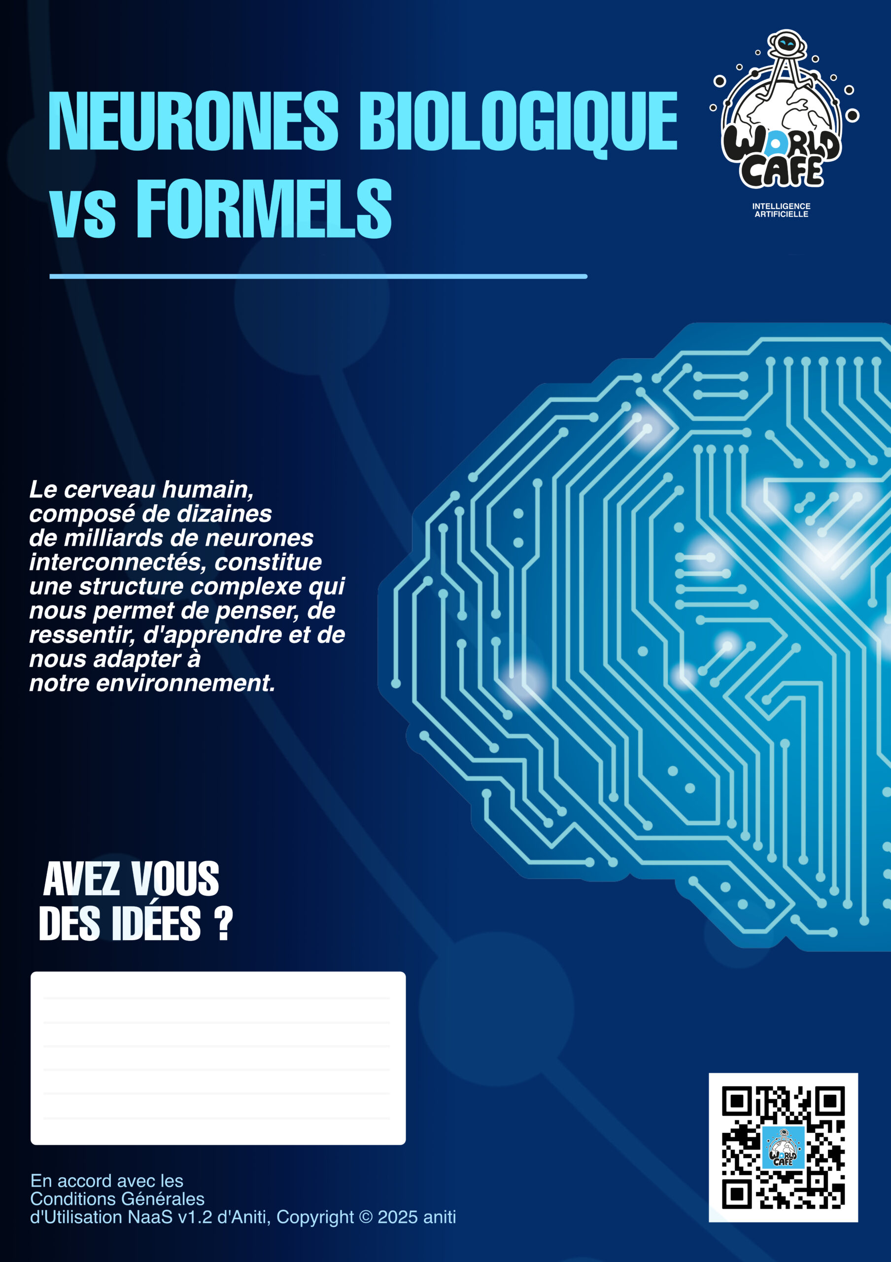 Dans ce cadre, j’ai été impliqué dans plusieurs aspects de l’organisation, notamment dans la conception éditoriale de l’événement. J’ai participé à la définition des thématiques abordées, à la formulation des questions destinées à guider les échanges et à l’adaptation des contenus pour les rendre accessibles et engageants pour les participants. J’ai également contribué à la création de visuels et de supports ludiques pour des jeux pédagogiques, inspirés de ressources issues de cafeia.org et de aniti.fr. Ces supports avaient pour objectif de stimuler la discussion, de vulgariser certains concepts liés à l’intelligence artificielle et de favoriser l’implication active des participants tout au long de l’événement.