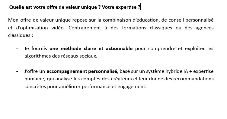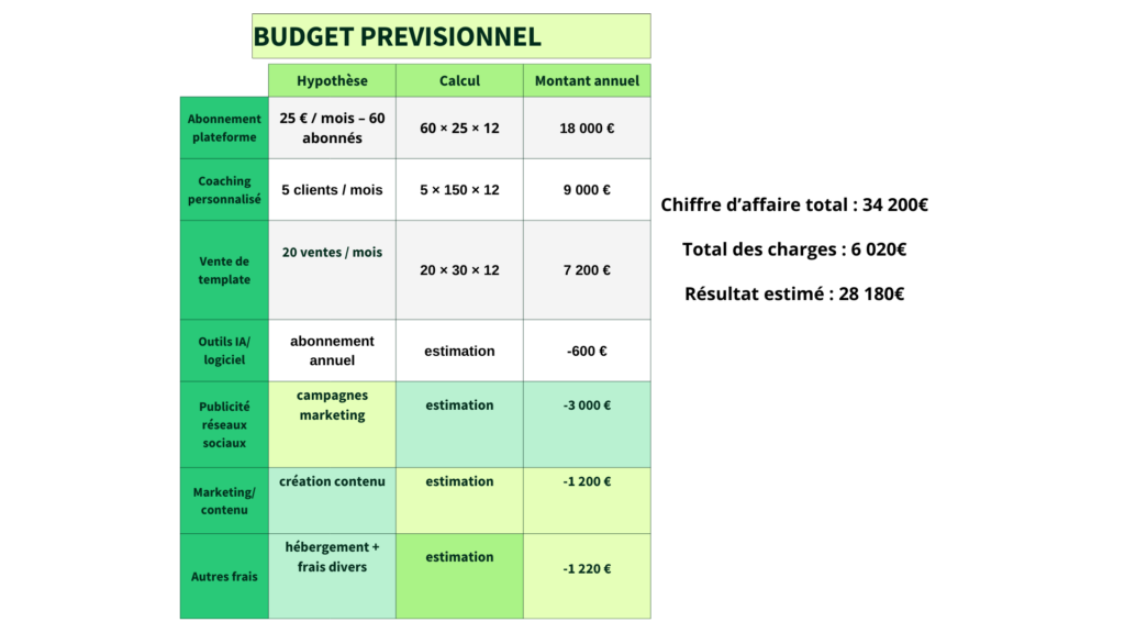 Ensuite, il a été compliqué de prévoir les revenus, car il fallait faire des hypothèses sur le nombre d’abonnés, de clients pour le coaching et les ventes de templates. Cela m’a obligé à me baser sur des recherches de marché et à réfléchir à une progression réaliste sur 12 mois.