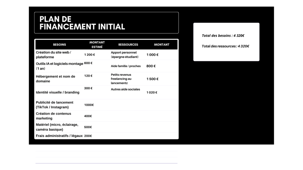 Pour ce projet fictif mais réaliste, j’ai élaboré un plan de financement et un budget prévisionnel afin de simuler le lancement d’une plateforme digitale destinée aux petits créateurs de contenu. En réalisant ce travail, j’ai rencontré plusieurs défis typiques d’un projet entrepreneurial.