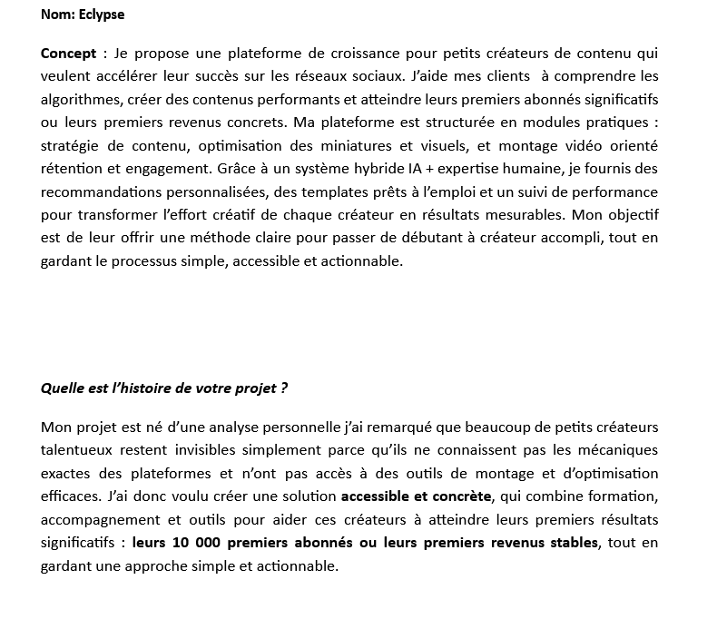 La première difficulté a été d’estimer précisément les besoins financiers, notamment pour les outils numériques et la création de la plateforme. En tant qu’étudiant, j’ai dû rester réaliste par rapport à mes ressources disponibles et prioriser les postes essentiels.